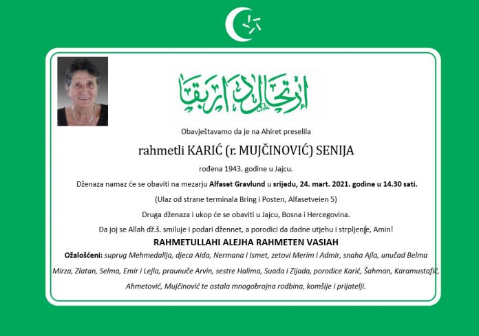 HomeO namaDženazeDženaza: rahmelti Karić Senija, Alfaset, srijeda 24.03.2021. u 14.30. Dženaze Dženaza: rahmelti Karić Senija, Alfaset, srijeda 24.03.2021. u 14.30. By D H Mon 9 Shaban 1442AH 22-3-2021AD 0 1619 FacebookXPinterestWhatsApp FacebookXPinterestWhatsApp Previous articleZavršeno predramazansko savjetovanje “Ramazanske vrijednosti – Putokaz mladima”Next articlePreuzmite novi BH GLASNIK, (august – decembar, 2020.) RELATIVNI SADRŽAJ Dženaze DŽENAZA: rahmetli Hafa Baručija, četvrtak 12.03. u 13.00 sati E H - Mon 20 Ramadan 1447AH 9-3-2026AD Dženaze DŽENAZA: rahmetli Kadira Ajanović, srijeda 04.02. u 14.00 sati E H - Mon 14 Shaban 1447AH 2-2-2026AD Dženaze DŽENAZA: rahmetli Mujo Karić, srijeda 14.01. u 12.00 sati E H - Sat 21 Rajab 1447AH 10-1-2026AD Popularno Praktična uputstva vezana za smrt Tue 26 Ramadan 1441AH 19-5-2020AD 8. NAMAZ korak po korak – Džuma namaz Thu 3 Shaban 1444AH 23-2-2023AD NAMAZ – Kratke sure IZGOVOR (Transkripcija) Mon 16 Shawwal 1441AH 8-6-2020AD Akika – kurban kojeg musliman prinosi na ime svog djeteta Tue 26 Ramadan 1441AH 19-5-2020AD Load more