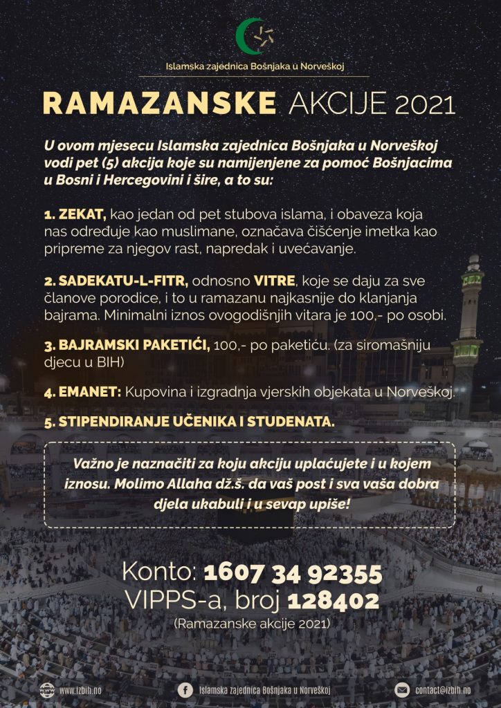 U ovom mjesecu Islamska zajednica Bošnjaka u Norveškoj vodi pet (5) akcija koje su namijenjene za pomoć Bošnjacima u Bosni i Hercegovini i šire, a to su: