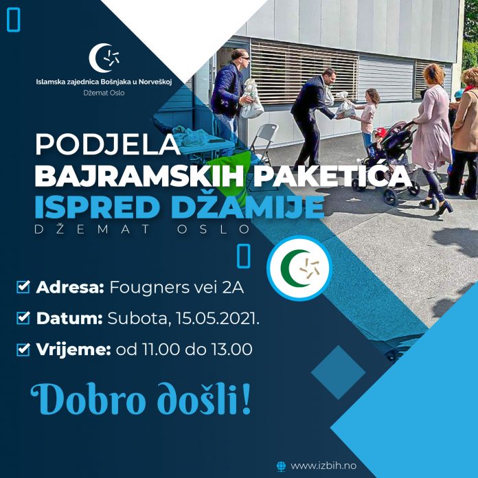 Ramazanski bajram nastupa u četvrtak, 13.05.2021. a mi vas pozivamo da dođete ispred džamije na podjelu bajramskih paketića u subotu, 15.05.2021. između 11.00 i 13.00 sati. Adresa je Fougners vei 2A.