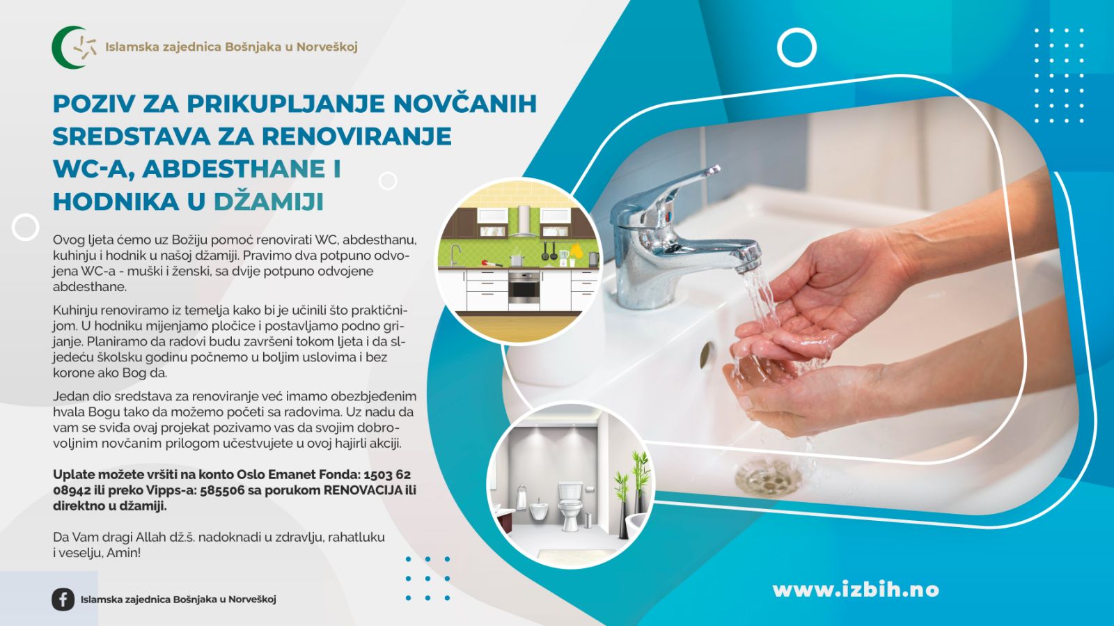 Uplate možete vršiti na konto Oslo Emanet Fonda: 1503 62 08942 ili preko Vipps-a: 585506 sa porukom RENOVACIJA ili direktno u džamiji.