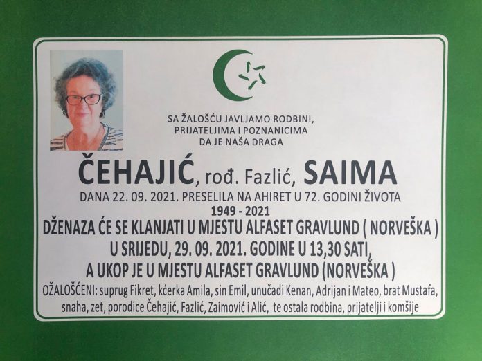 HomeO namaDženazeDženaza i ukop: rahmetli Čehajić Saima, SRIJEDA 29-09-2021. Alfaset, u 13.30 Dženaze Dženaza i ukop: rahmetli Čehajić Saima, SRIJEDA 29-09-2021. Alfaset, u 13.30 By D H Mon 20 Safar 1443AH 27-9-2021AD 0 1119 FacebookXPinterestWhatsApp FacebookXPinterestWhatsApp Previous articleDivno vrijeme i atmosfera na mektebskom izletu u Oslu (FOTO)Next articlePrva dženaza bez korona mjera (FOTO) RELATIVNI SADRŽAJ Dženaze DŽENAZA: rahmetli Hafa Baručija, četvrtak 12.03. u 13.00 sati E H - Mon 20 Ramadan 1447AH 9-3-2026AD Dženaze DŽENAZA: rahmetli Kadira Ajanović, srijeda 04.02. u 14.00 sati E H - Mon 14 Shaban 1447AH 2-2-2026AD Dženaze DŽENAZA: rahmetli Mujo Karić, srijeda 14.01. u 12.00 sati E H - Sat 21 Rajab 1447AH 10-1-2026AD Popularno Praktična uputstva vezana za smrt Tue 26 Ramadan 1441AH 19-5-2020AD 8. NAMAZ korak po korak – Džuma namaz Thu 3 Shaban 1444AH 23-2-2023AD NAMAZ – Kratke sure IZGOVOR (Transkripcija) Mon 16 Shawwal 1441AH 8-6-2020AD Akika – kurban kojeg musliman prinosi na ime svog djeteta Tue 26 Ramadan 1441AH 19-5-2020AD Load more