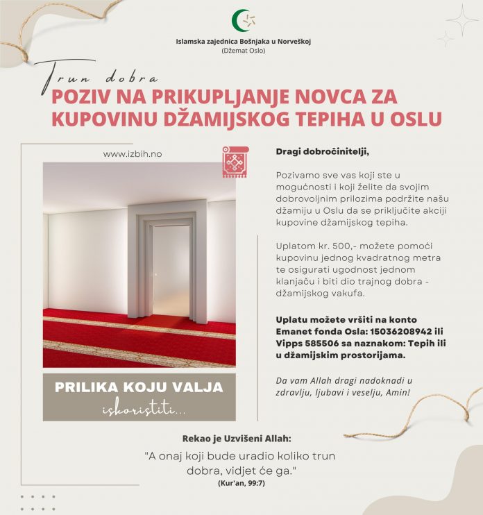 Uplatu možete vršiti na konto Emanet fonda Osla: 15036208942 ili Vipps 585506 sa naznakom: Tepih ili u džamijskim prostorijama.