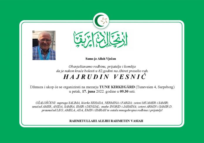 HomeO namaDženazeDženaza: rahmetli Hajrudinu Vesniću, petak 17.06., u 09.30 sati Dženaze Dženaza: rahmetli Hajrudinu Vesniću, petak 17.06., u 09.30 sati By D H Wed 16 Dhul Qidah 1443AH 15-6-2022AD 0 1823 FacebookTwitterPinterestWhatsApp FacebookTwitterPinterestWhatsApp Previous articleOdržana sjednica Skupštine Islamske zajednice Bošnjaka u NorveškojNext articleDženaza: rahmetli Behiji Bukvić Karaga, ponedjeljak 20.06., u 10.30 sati RELATIVNI SADRŽAJ Dženaze Rahmetli Zumra Bešić, četvrtak 30.10.2025., u 11:30h E H - Mon 5 Jumada Al Oula 1447AH 27-10-2025AD Dženaze Rahmetli Amina Muslić, srijeda 22.10.2025., u 10h E H - Mon 28 Rabi Al Thani 1447AH 20-10-2025AD Dženaze Rahmetli Emir Ćulum, srijeda 08.10.2025., u 11:00 h E H - Fri 11 Rabi Al Thani 1447AH 3-10-2025AD Popularno Praktična uputstva vezana za smrt Tue 26 Ramadan 1441AH 19-5-2020AD 8. NAMAZ korak po korak – Džuma namaz Thu 3 Shaban 1444AH 23-2-2023AD NAMAZ – Kratke sure IZGOVOR (Transkripcija) Mon 16 Shawwal 1441AH 8-6-2020AD Akika – kurban kojeg musliman prinosi na ime svog djeteta Tue 26 Ramadan 1441AH 19-5-2020AD Load more