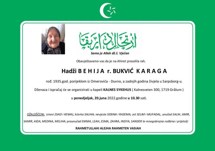 HomeO namaDženazeDženaza: rahmetli Behiji Bukvić Karaga, ponedjeljak 20.06., u 10.30 sati Dženaze Dženaza: rahmetli Behiji Bukvić Karaga, ponedjeljak 20.06., u 10.30 sati By D H Fri 18 Dhul Qidah 1443AH 17-6-2022AD 0 913 FacebookTwitterPinterestWhatsApp FacebookTwitterPinterestWhatsApp Previous articleDženaza: rahmetli Hajrudinu Vesniću, petak 17.06., u 09.30 satiNext articleDženaza: rahmetli Asmir Pačo, na mezarju Alfaset u Oslu, utorak, 28.06.2022. u 13.30. RELATIVNI SADRŽAJ Dženaze Rahmetli Zumra Bešić, četvrtak 30.10.2025., u 11:30h E H - Mon 5 Jumada Al Oula 1447AH 27-10-2025AD Dženaze Rahmetli Amina Muslić, srijeda 22.10.2025., u 10h E H - Mon 28 Rabi Al Thani 1447AH 20-10-2025AD Dženaze Rahmetli Emir Ćulum, srijeda 08.10.2025., u 11:00 h E H - Fri 11 Rabi Al Thani 1447AH 3-10-2025AD Popularno Praktična uputstva vezana za smrt Tue 26 Ramadan 1441AH 19-5-2020AD 8. NAMAZ korak po korak – Džuma namaz Thu 3 Shaban 1444AH 23-2-2023AD NAMAZ – Kratke sure IZGOVOR (Transkripcija) Mon 16 Shawwal 1441AH 8-6-2020AD Akika – kurban kojeg musliman prinosi na ime svog djeteta Tue 26 Ramadan 1441AH 19-5-2020AD Load more