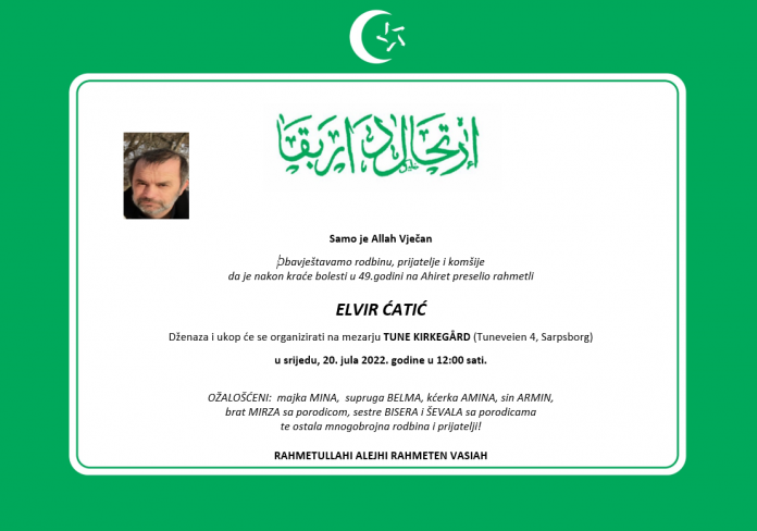 HomeO namaDženazeDženaza: rahmetli Elvir Ćatić, srijeda 20.07., u 12:00 sati Dženaze Dženaza: rahmetli Elvir Ćatić, srijeda 20.07., u 12:00 sati By D H Tue 20 Dhul Hijjah 1443AH 19-7-2022AD 0 1183 FacebookTwitterPinterestWhatsApp FacebookTwitterPinterestWhatsApp Previous articlePreuzmite novi BH GLASNIK – Broj 2, (april – juni 2022)Next articleNova hidžretska 1444. godina nastupa večeras RELATIVNI SADRŽAJ Dženaze Rahmetli Zumra Bešić, četvrtak 30.10.2025., u 11:30h E H - Mon 5 Jumada Al Oula 1447AH 27-10-2025AD Dženaze Rahmetli Amina Muslić, srijeda 22.10.2025., u 10h E H - Mon 28 Rabi Al Thani 1447AH 20-10-2025AD Dženaze Rahmetli Emir Ćulum, srijeda 08.10.2025., u 11:00 h E H - Fri 11 Rabi Al Thani 1447AH 3-10-2025AD Popularno Praktična uputstva vezana za smrt Tue 26 Ramadan 1441AH 19-5-2020AD 8. NAMAZ korak po korak – Džuma namaz Thu 3 Shaban 1444AH 23-2-2023AD NAMAZ – Kratke sure IZGOVOR (Transkripcija) Mon 16 Shawwal 1441AH 8-6-2020AD Akika – kurban kojeg musliman prinosi na ime svog djeteta Tue 26 Ramadan 1441AH 19-5-2020AD Load more