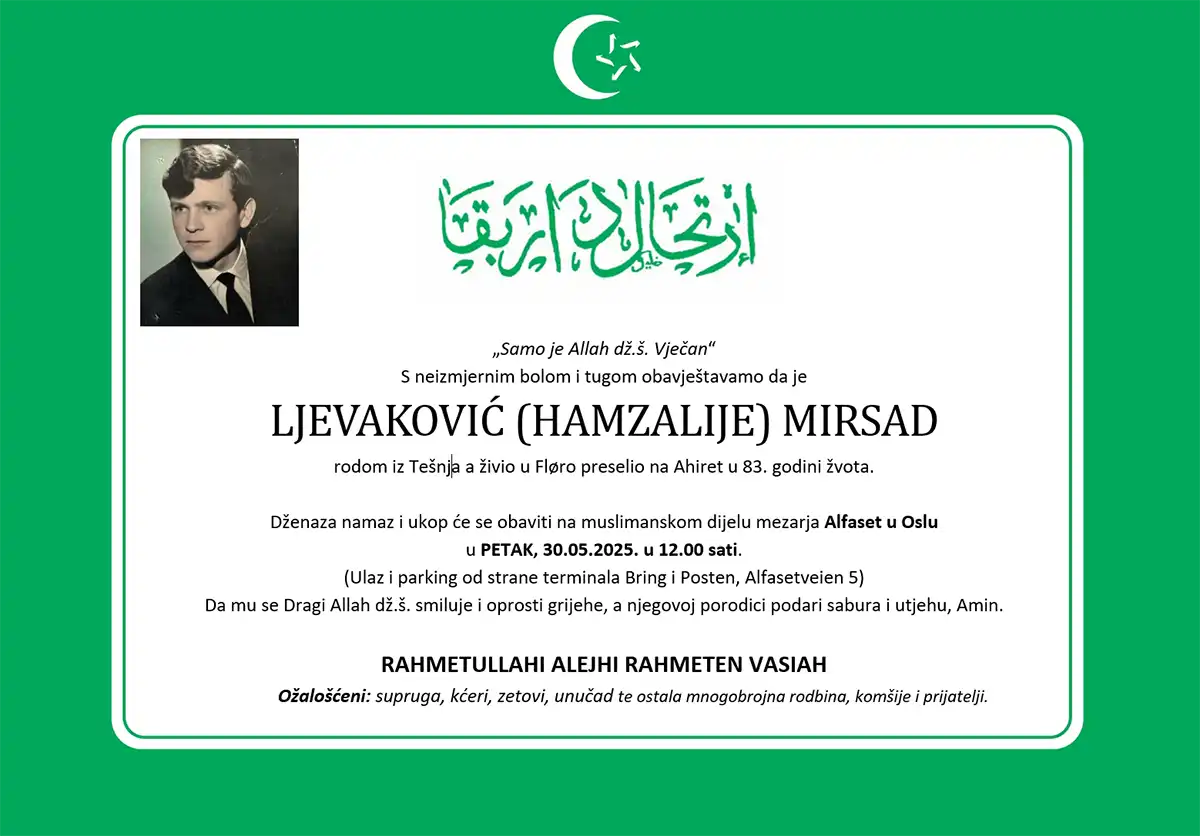HomeO namaDženazeDŽENAZA: rahmetli Mirsad Ljevaković, petak 30.05. u 12.00 na Alfasetu Dženaze DŽENAZA: rahmetli Mirsad Ljevaković, petak 30.05. u 12.00 na Alfasetu By E H Wed 1 Dhul Hijjah 1446AH 28-5-2025AD 0 209 FacebookTwitterPinterestWhatsApp FacebookTwitterPinterestWhatsApp Previous articleDrammen: Džematsko druženje povodom 31. majaNext article10 DANA ZA DUŠU – Prvih deset dana Zul-hidždžeta (VIDEO) RELATIVNI SADRŽAJ Dženaze Rahmetli Zumra Bešić, četvrtak 30.10.2025., u 11:30h E H - Mon 5 Jumada Al Oula 1447AH 27-10-2025AD Dženaze Rahmetli Amina Muslić, srijeda 22.10.2025., u 10h E H - Mon 28 Rabi Al Thani 1447AH 20-10-2025AD Dženaze Rahmetli Emir Ćulum, srijeda 08.10.2025., u 11:00 h E H - Fri 11 Rabi Al Thani 1447AH 3-10-2025AD Popularno Praktična uputstva vezana za smrt Tue 26 Ramadan 1441AH 19-5-2020AD 8. NAMAZ korak po korak – Džuma namaz Thu 3 Shaban 1444AH 23-2-2023AD NAMAZ – Kratke sure IZGOVOR (Transkripcija) Mon 16 Shawwal 1441AH 8-6-2020AD Akika – kurban kojeg musliman prinosi na ime svog djeteta Tue 26 Ramadan 1441AH 19-5-2020AD Load more