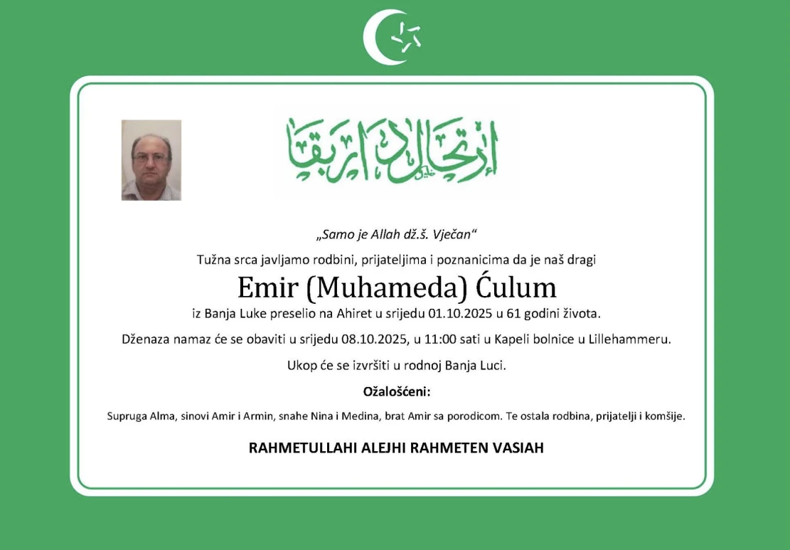 HomeO namaDženazeRahmetli Emir Ćulum, srijeda 08.10.2025., u 11:00 h