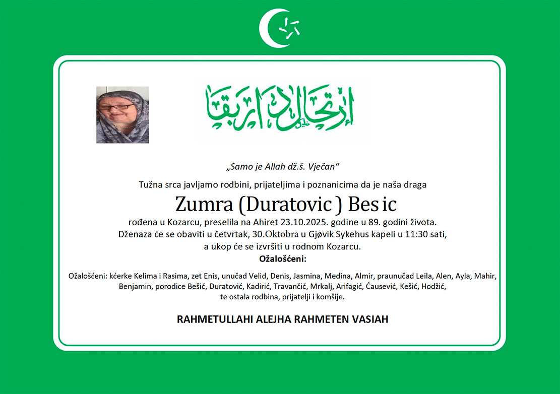 HomeO namaDženazeRahmetli Zumra Bešić, četvrtak 30.10.2025., u 11:30h