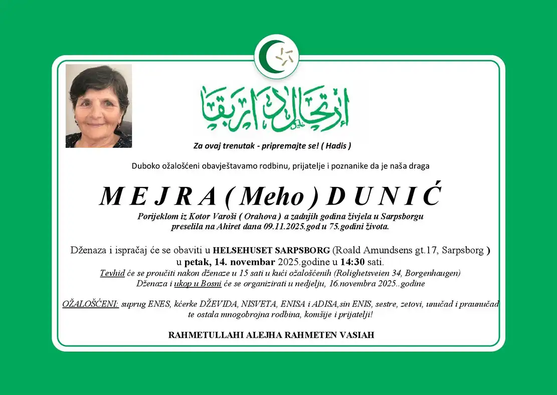 HomeO namaDženazeRahmetli Mejra Dunić, petak 14.11.2025., u 14:30h Dženaze Rahmetli Mejra Dunić, petak 14.11.2025., u 14:30h By E H Wed 21 Jumada Al Oula 1447AH 12-11-2025AD 0 476 FacebookTwitterPinterestWhatsApp FacebookTwitterPinterestWhatsApp Previous articleKur’an je ovo rekao prije 1400 godina! (VIDEO)Next articlePremijer Norveške Jonas Gahr Støre posjetio Islamsku zajednicu Bošnjaka u Norveškoj RELATIVNI SADRŽAJ Dženaze DŽENAZA: rahmetli Kadira Ajanović, srijeda 04.02. u 14.00 sati E H - Mon 14 Shaban 1447AH 2-2-2026AD Dženaze DŽENAZA: rahmetli Mujo Karić, srijeda 14.01. u 12.00 sati E H - Sat 21 Rajab 1447AH 10-1-2026AD Dženaze DŽENAZA: rahmetli hadži Hanumica Kolenović, srijeda 17.12. u 12.00 na Alfasetu E H - Mon 24 Jumada Al Akhira 1447AH 15-12-2025AD Popularno Praktična uputstva vezana za smrt Tue 26 Ramadan 1441AH 19-5-2020AD 8. NAMAZ korak po korak – Džuma namaz Thu 3 Shaban 1444AH 23-2-2023AD NAMAZ – Kratke sure IZGOVOR (Transkripcija) Mon 16 Shawwal 1441AH 8-6-2020AD Akika – kurban kojeg musliman prinosi na ime svog djeteta Tue 26 Ramadan 1441AH 19-5-2020AD Load more