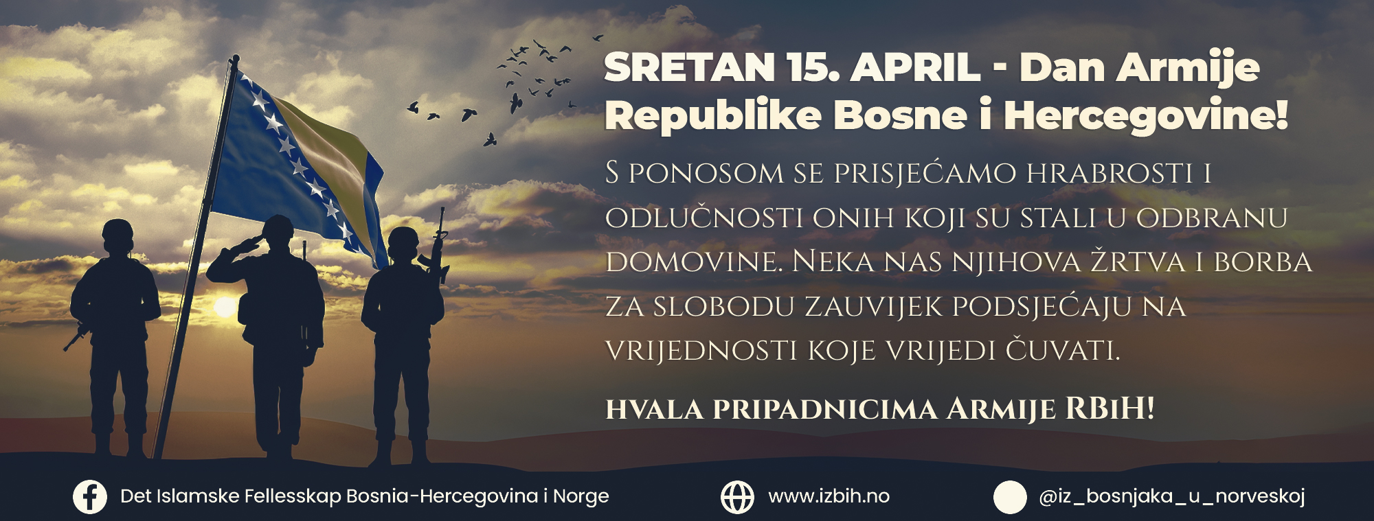 HomeNovostiS ponosom se sjećamo i obilježavamo 15. april - Dan Armija Republike... Novosti S ponosom se sjećamo i obilježavamo 15. april – Dan Armija Republike Bosne i Hercegovine By E H Wed 27 Shawwal 1447AH 15-4-2026AD 0 5 FacebookXPinterestWhatsApp FacebookXPinterestWhatsApp Previous articleSUSRETI BOŠNJAKA 2026 — Horten, 23. maj (VIDEO) RELATIVNI SADRŽAJ Novosti Susreti Bošnjaka 2026 – (Horten) E H - Sun 24 Shawwal 1447AH 12-4-2026AD Novosti Muftija Kobilica u Oslu: Iskušenja života rješenja pronalaze u trajnim vrijednostima E H - Fri 22 Shawwal 1447AH 10-4-2026AD Novosti Ermin kuka održao predavanje mladima iz Norveške u Višegradu E H - Fri 15 Shawwal 1447AH 3-4-2026AD Popularno Praktična uputstva vezana za smrt Tue 26 Ramadan 1441AH 19-5-2020AD 8. NAMAZ korak po korak – Džuma namaz Thu 3 Shaban 1444AH 23-2-2023AD NAMAZ – Kratke sure IZGOVOR (Transkripcija) Mon 16 Shawwal 1441AH 8-6-2020AD Akika – kurban kojeg musliman prinosi na ime svog djeteta Tue 26 Ramadan 1441AH 19-5-2020AD Load more